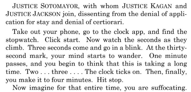 Thursday’s dissent began by directly addressing her reader. Sotomayor told the reader to take out their phone’s stopwatch app and count out to four minutes.