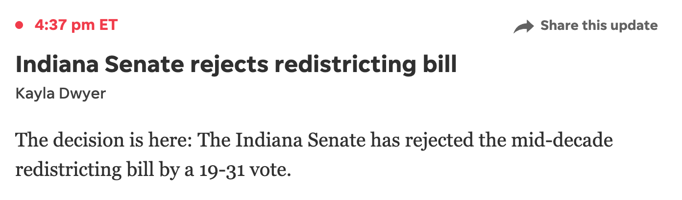 The Indiana vote was a genuine shock and about the last thing I would have expected. Hopefully it's a harbinger.
