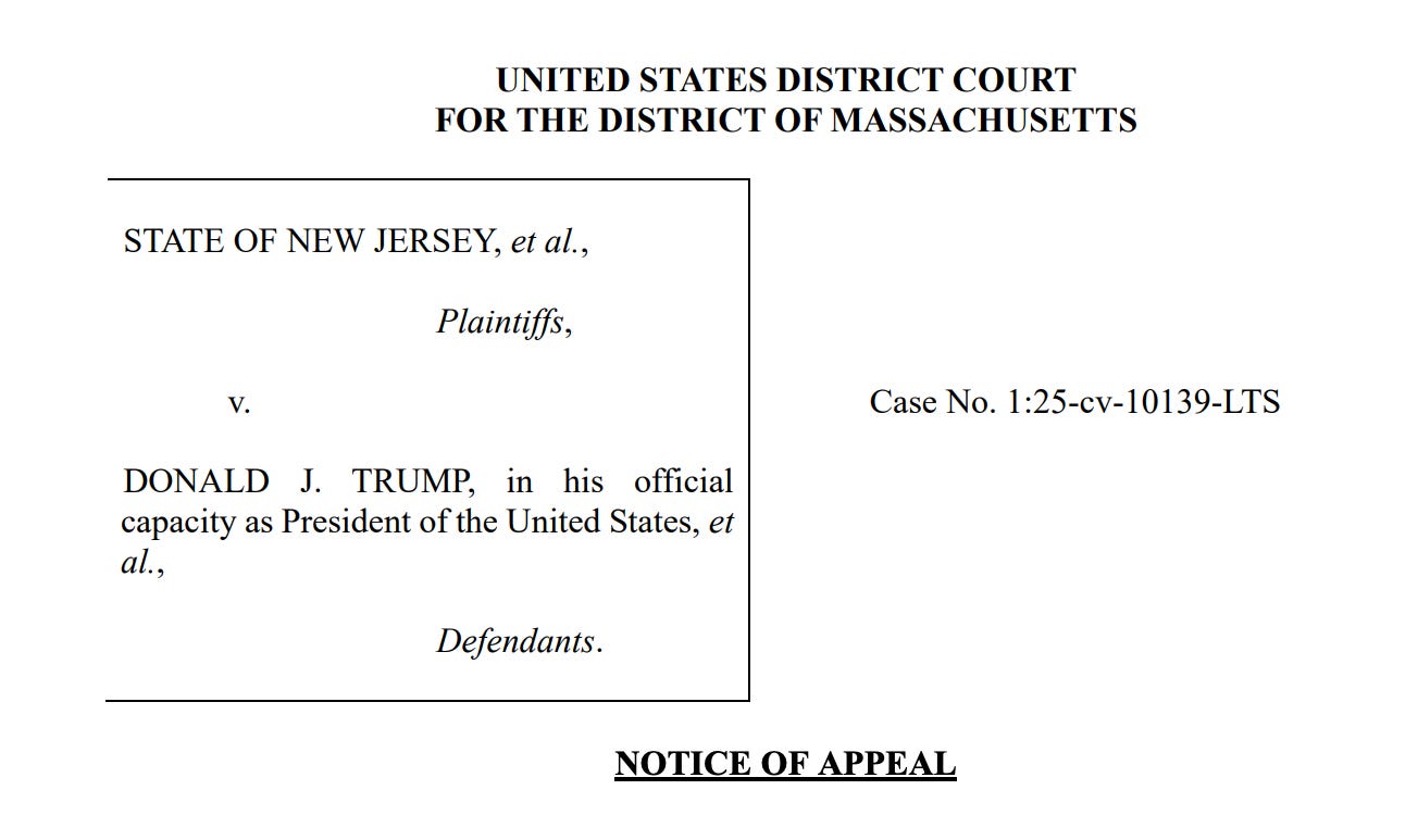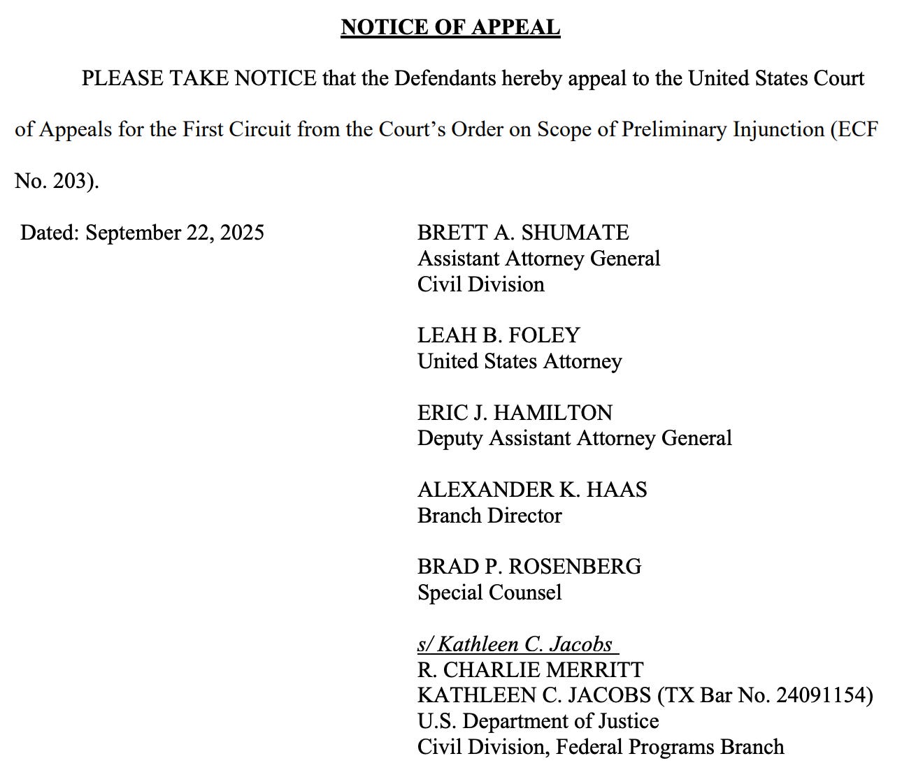 This September 22 filing is appealing the July 25 order from Sorokin — which kept the nationwide injunction in place in that case in the aftermath of June’s Supreme Court ruling ending some “universal” injunctions but noting that some multistate cases could, arguably, require nationwide relief. On remand, Sorokin found just that, ruling that such nationwide scope is necessary to “provide complete relief to the plaintiffs in this case.”