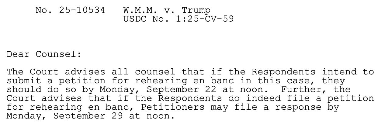 DOJ — rather than rushing to the Supreme Court like it has done in other situations — took the Fifth Circuit up on that offer, filing a petition for rehearing en banc on that last day, September 22. (For what it’s worth, the docket entry notes that it was “[Entered: 09/22/2025 12:01 PM],” and it is not clear if that is when DOJ filed it or the court put it on the docket. An addendum to the entry, however, later stated that the deadline was “canceled.”)