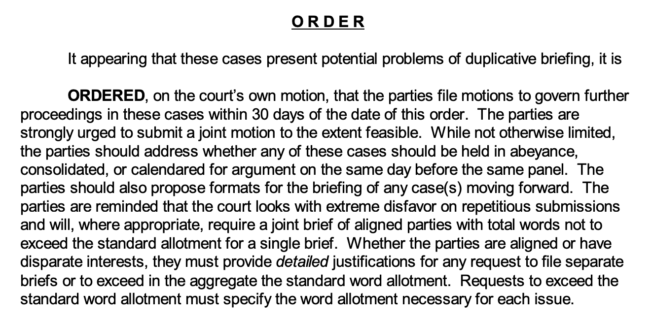 On Tuesday, though, the D.C. Circuit itself issued its order in all four cases. The order, the court’s clerk stated on behalf of the court, was being issued because it “appear[s] that these cases present potential problems of duplicative briefing.”