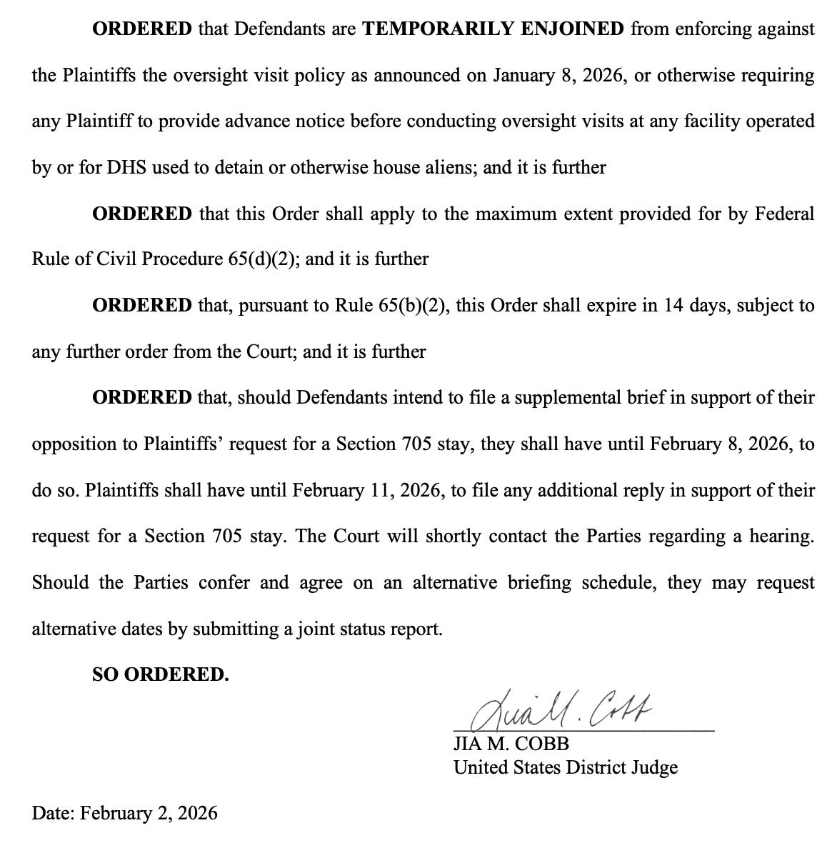 In December, Cobb issued her initial order and opinion blocking U.S. Immigration and Customs Enforcement policies requiring seven-day notice for members of Congress to access facilities and asserting that ICE field offices were not subject to the appropriations oversight visitation requirement.