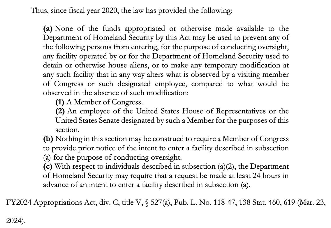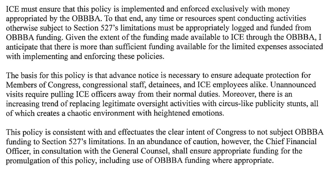 After the ICE killing of Rennee Good three weeks later on January 7, however, Homeland Security Secretary Kristi Noem issued a new policy on January 8, purporting to get around Cobb’s order with a new seven-day notice policy and a claim that all congressional oversight visits are to be funded through the One Big Beautiful Bill Act (OBBBA), which did not include a Section 527 requirement. From the policy memorandum: