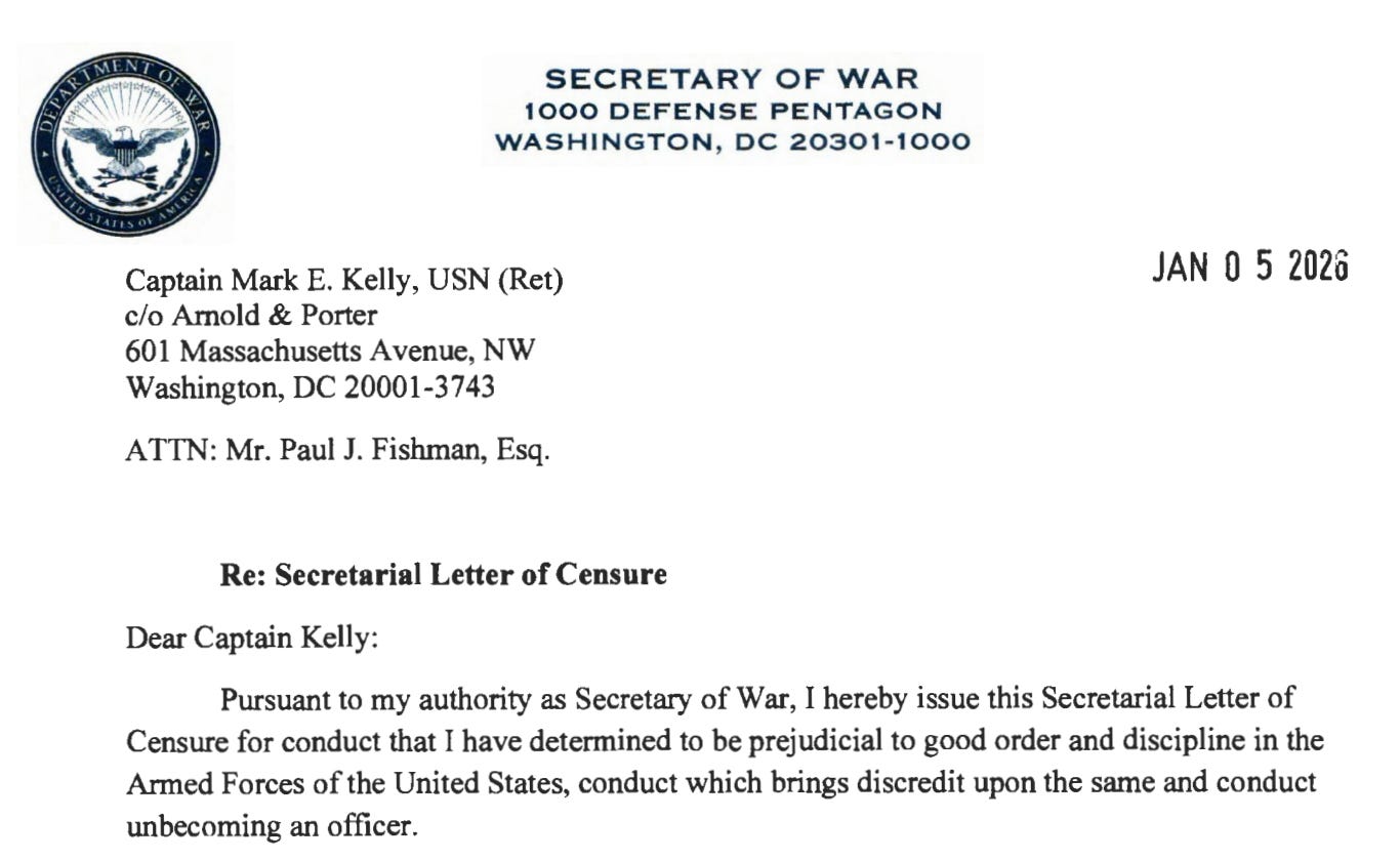 After the posting of the video on November 18, President Donald Trump predictably melted down, and Hegseth quickly followed up — investigating Kelly and settling on censuring him on January 5 and seeking to reduce his retirement pay.