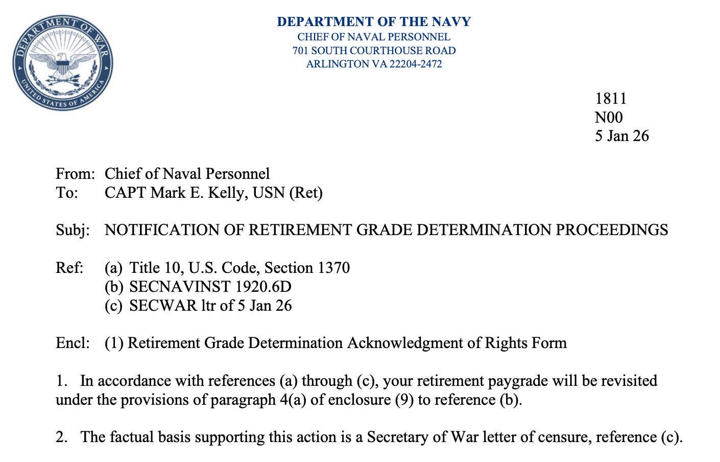 When the Navy immediately followed up on Hegseth’s censure that same day by notifying Kelly that his “retirement paygrade will be revisited” due to the censure and giving him “10 working days” to respond without “waiv[ing]” his rights, Kelly’s lawyers — who initially reached out to the Navy in December — followed up quickly.