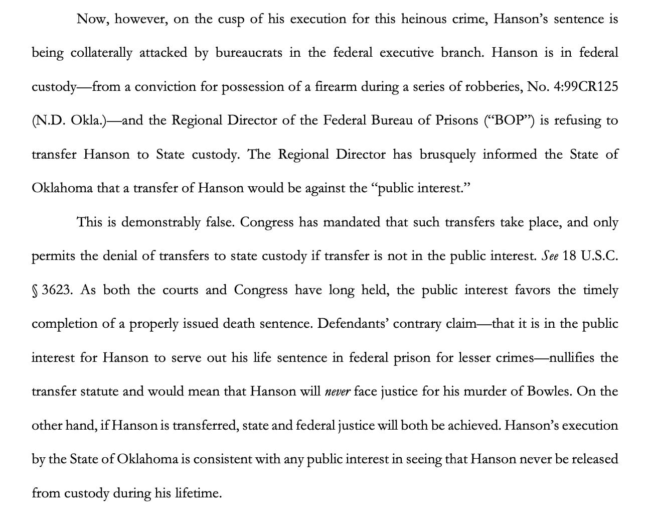 Oklahoma argues "state and federal justice will both be achieved" by executing Hanson, currently serving a life sentence in federal prison. The feds have said transfer is not in the public interest.