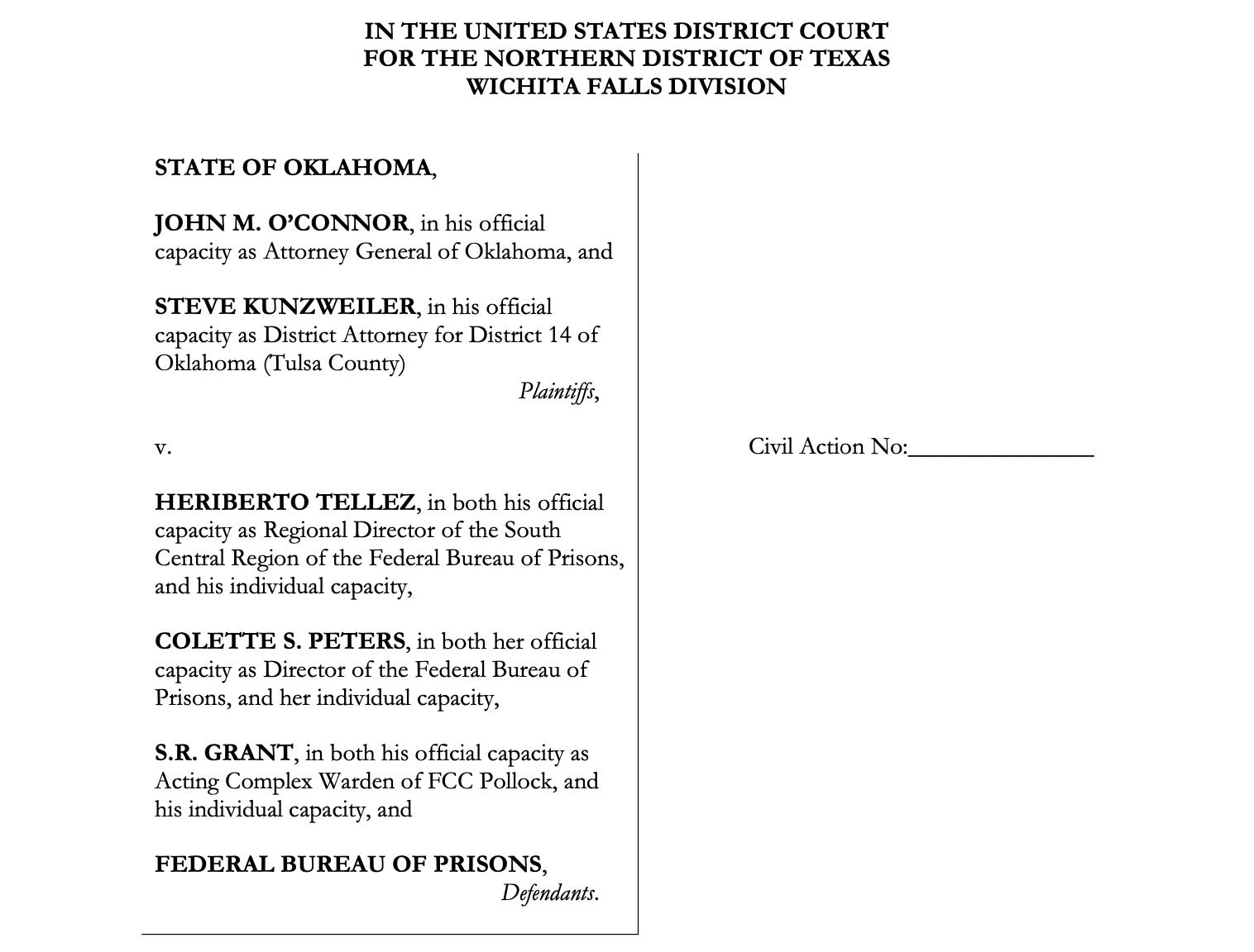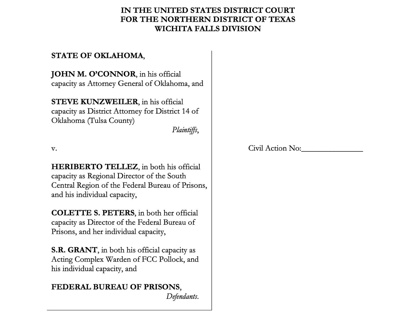 “Venue is proper in this Court pursuant to 28 U.S.C. § 1391(e)(1) because several Defendants—custodians of inmate John Hanson—reside in this District,” the lawsuit notes. “The Wichita Falls Division of the Northern District of Texas is approximately halfway between the BOP Defendants living in the Northern District of Texas and the State of Oklahoma Plaintiffs residing in Oklahoma City, Oklahoma.”