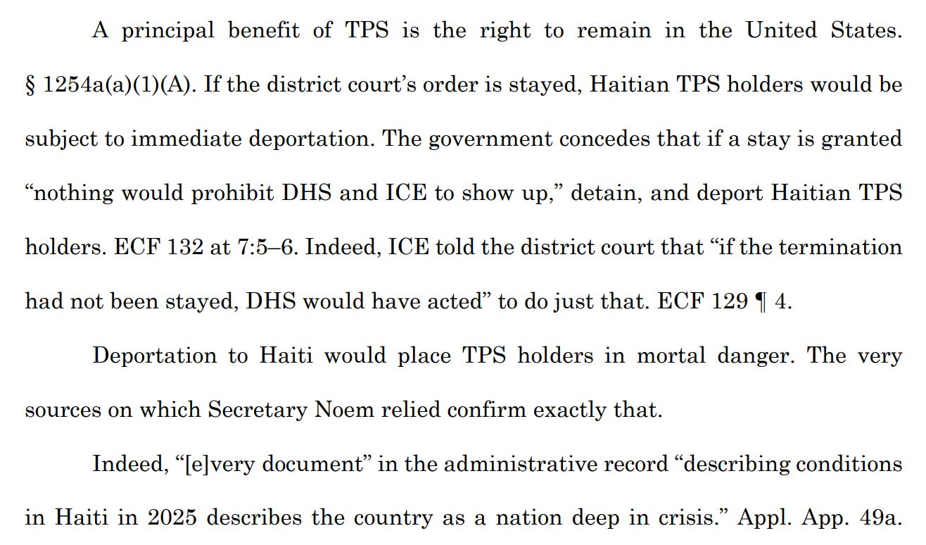 In DOJ’s requests, it had pointed to two prior Supreme Court shadow docket stays of lower court orders blocking TPS revocations — involving Venezuela — as proof that stays in these cases were not only obvious, but to claim that lower courts that had concluded otherwise were engaged in “persistent disregard for this Court’s stay orders.”
