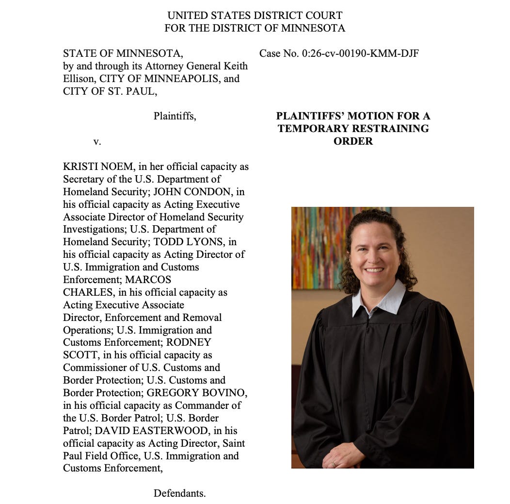 In the lawsuit filed by Minnesota, Minneapolis, and St. Paul on January 12, the state and cities are seeking a temporary restraining order — which Menendez is considering treating as a request for a preliminary injunction. DOJ is opposing the request.