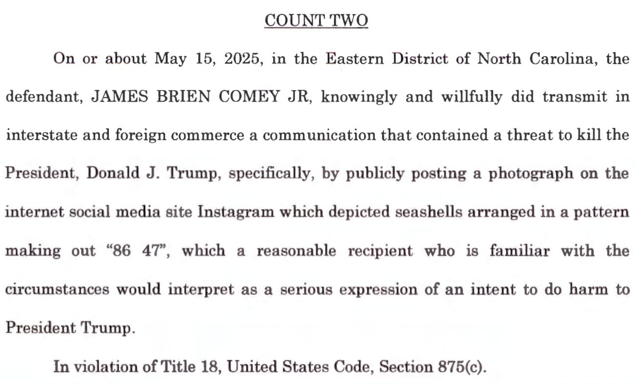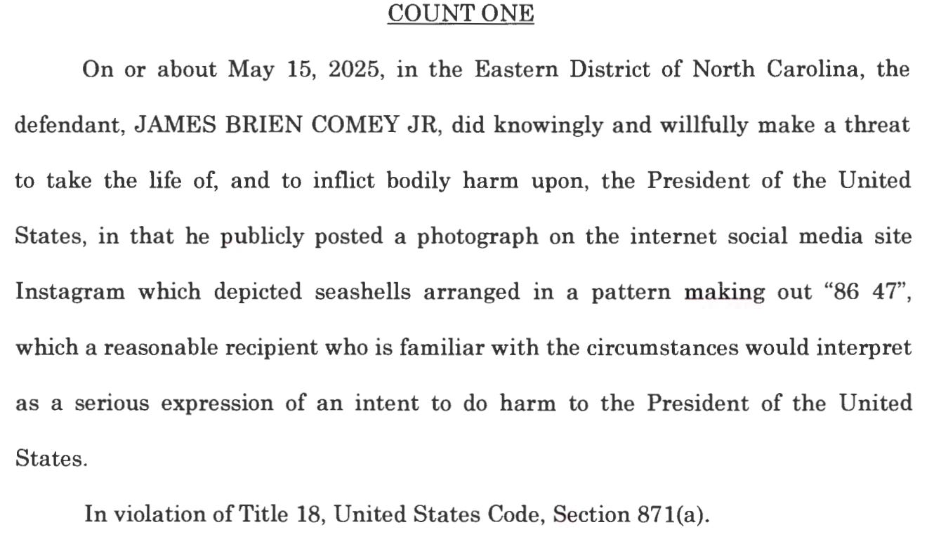 DOJ — which already unsuccessfully indicted Comey once — instead decided to try again, following what Blanche said was an ongoing investigation that already took 11 months, using this since-deleted Instagram post as the basis for a count alleging that Comey “ma[d]e a threat to take the life of, and to inflict bodily harm upon, the President of the States.“