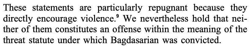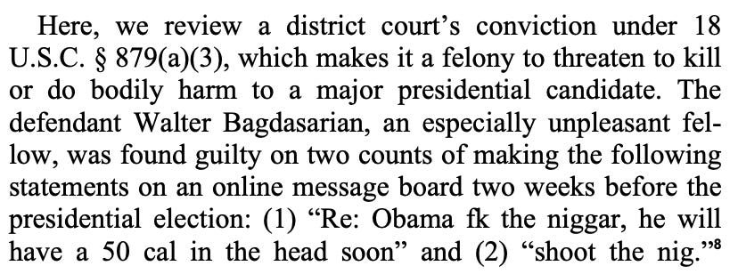 To that end, and as others have pointed to on Tuesday, the U.S. Court of Appeals for the Ninth Circuit overturned a conviction back in 2011 under a related statute — despite the charged conduct containing far more violent and direct language — when a man posted on a message board that then-candidate Barack Obama “will have a 50 cal in the head soon,“ later posted “shoot the nig,” and posted other racist, offensive language as detailed in Judge Stephen Reinhardt’s opinion for the court: