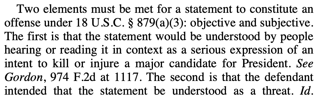 But, as to the actual threat statute under which DOJ nonetheless sought Tuesday’s indictment, the First Amendment “true threats” doctrine — most recently explained by the U.S. Supreme Court in 2023’s Counterman v. Colorado — would apply and the statute’s objective (recipient) element and subjective (defendant) element would need to be proved beyond a reasonable doubt.