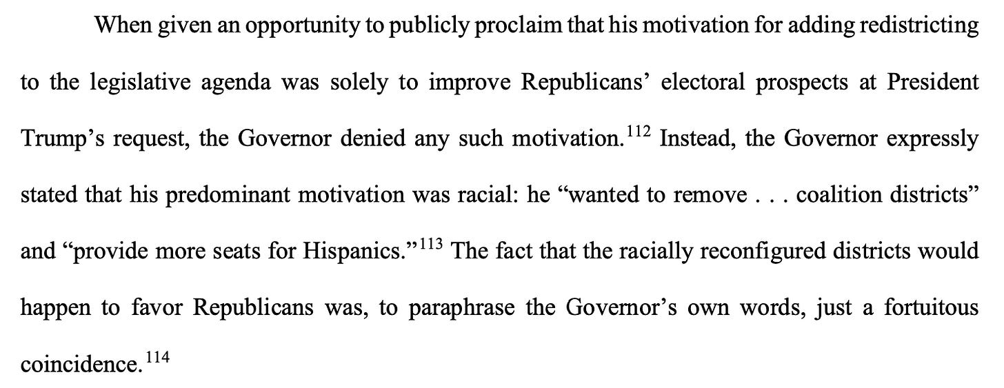 Direct evidence in the preliminary-injunction hearing shows that key legislators in the 2025 redistricting process had the same racial objectives as DOJ and the Governor.