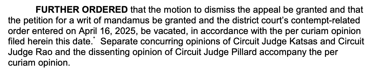 That means the panel’s order stands. Under the panel’s order, the bottom line is that mandamus was granted — meaning an order is being sent to Boasberg. That was a 2-1 decision granted by two Trump appointees to the court, Judges Gregory Katsas and Neomi Rao. What do the order and related per curiam opinion say?