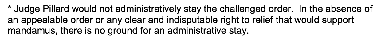 “[M]y colleagues, each for a distinct and non-overlapping reason, vote to grant a writ of mandamus to vacate the district court’s Order,” she wrote. “The right to relief is only ‘clear and indisputable’ when a petitioner ‘can point to cases in which a federal court has held that relief is warranted in a matter involving like issues and comparable circumstances.’ … Neither defendants nor my colleagues cite to any such cases. Moreover, I am unaware of any prior case in which a court has asserted the clarity on which mandamus relief depends without a majority agreeing as to what is so clear.“