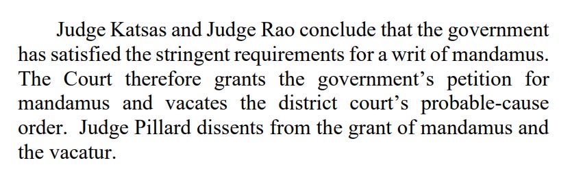 The panel was unanimous that Boasberg’s order was not appealable, but Katsas and Rao ruled that mandamus — which is an extraordinary order only to be issued when the party seeking it has a “clear and indisputable right to relief,” as Pillard had noted back in April — should be granted.