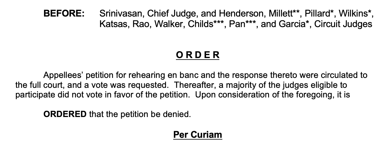 The full D.C. Circuit is made up of 11 active judges — seven Democratic appointees and four Republican appointees (including three Trump appointees) — so it was clear the full court would take an en banc petition seriously in a matter like this.