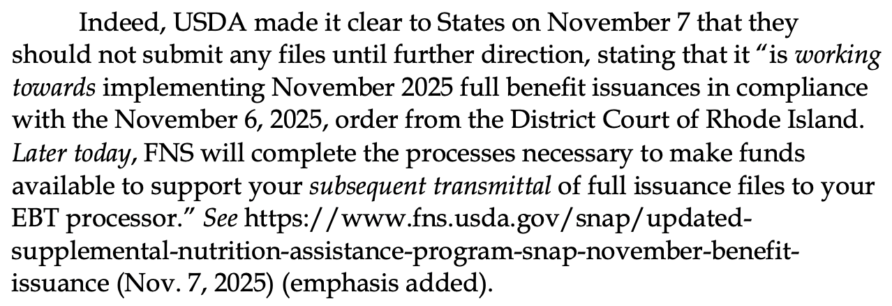 The latest letter from Patrick Penn — the Deputy Under Secretary of Food, Nutrition, and Consumer Services — stated that the change was based on the administrative stay issued by Justice Ketanji Brown Jackson on the night of October 7. In relevant part and based solely on the administrative stay — which Jackson made clear is temporary — the states were told: