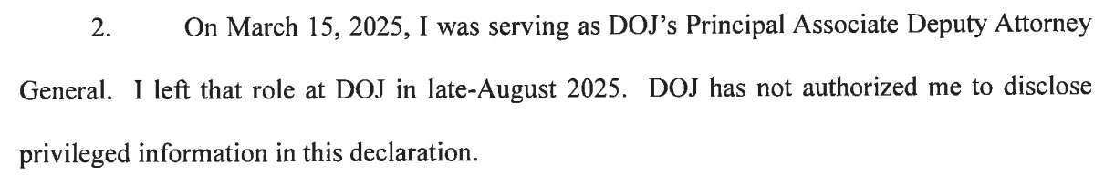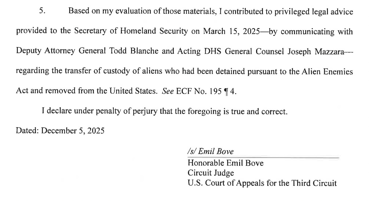 Bove signed the declaration as coming from “Honorable Emil Bove, Circuit Judge, U.S. Court of Appeals for the Third Circuit” and acknowledged that DOJ “has not authorized me to disclose privileged information in this declaration.“