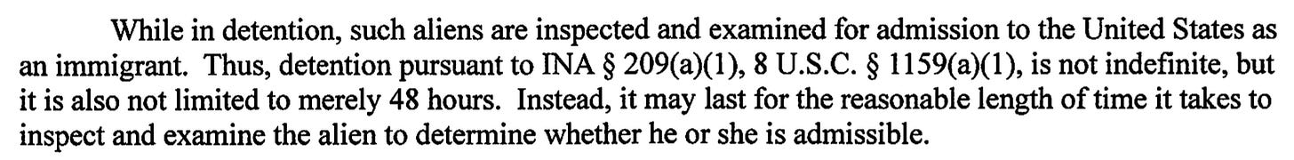 That’s not all. The Edlow-Lyons memo goes further, stating that detention for this purpose “is not indefinite, but also is not limited to merely 48 hours.”