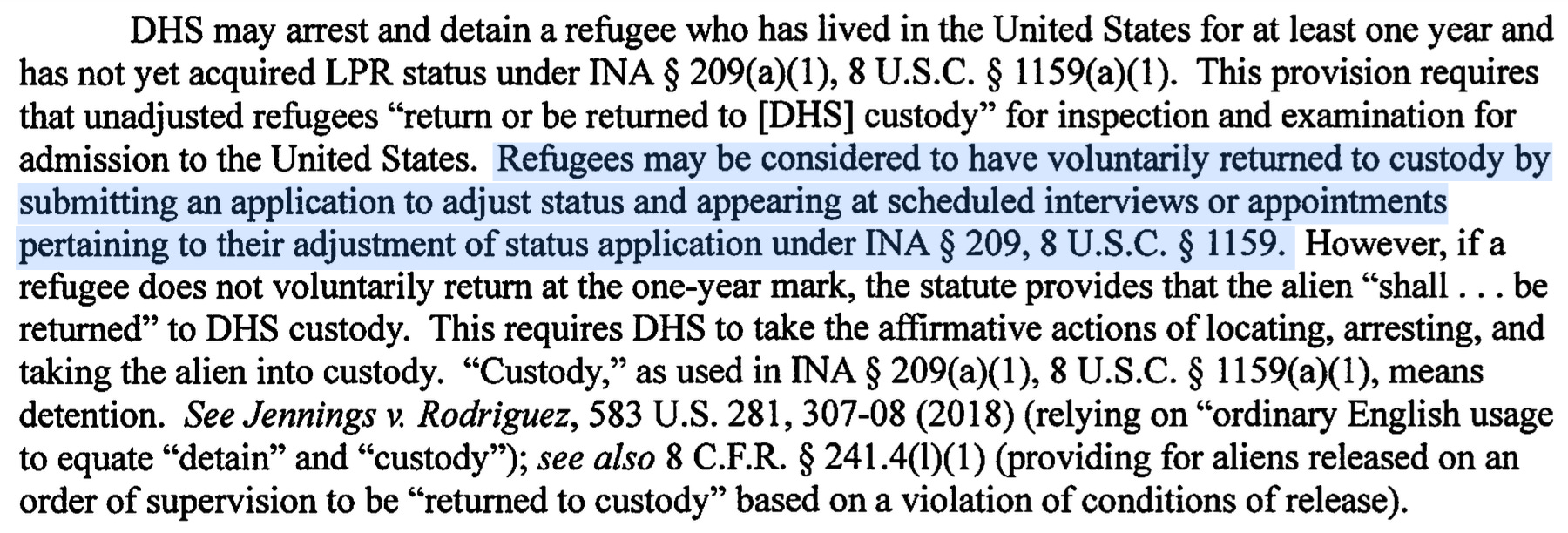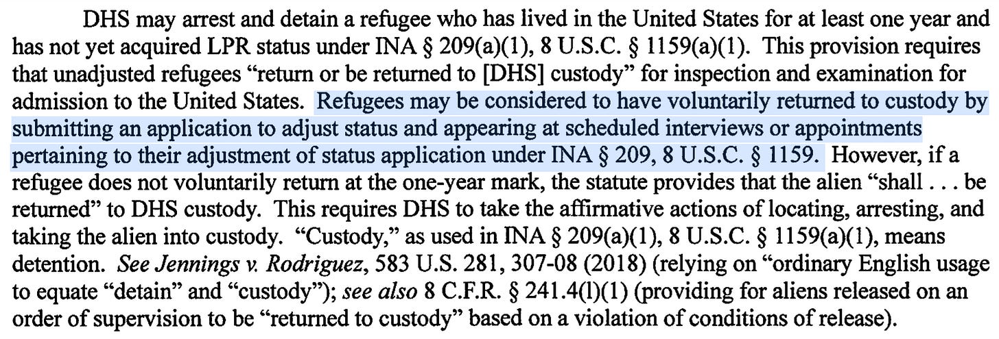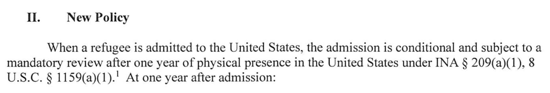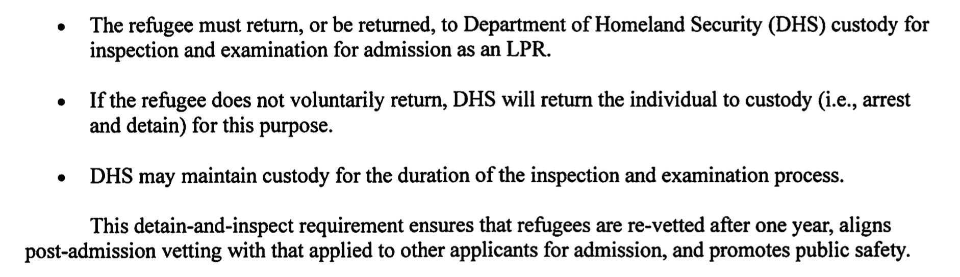 In the “New Policy” section of the memo, Edlow and Lyons declare that refugees who do not obtain LPR status — obtain a green card — after a year either need to return to DHS or DHS will arrest and detain them for “inspection and examination for admission as an LPR.”