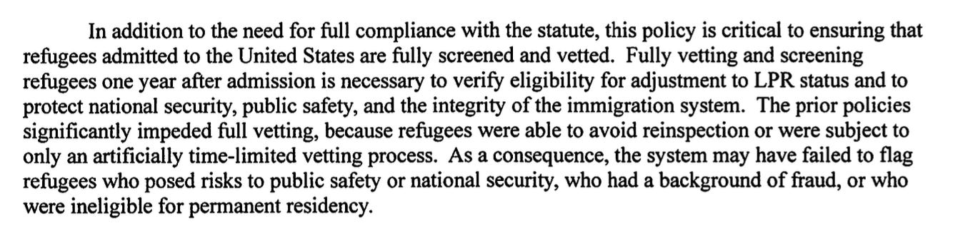 Edlow and Lyons claim, vaguely, that of “31,000 refugees admitted to the United States from Ecuador, El Salvador, Guatemala, Honduras, and Venezuela from 2021 to 2024,“ the review determined that “[o]ver 42% had been insufficiently vetted to determine whether or not they presented a public safety concern.“