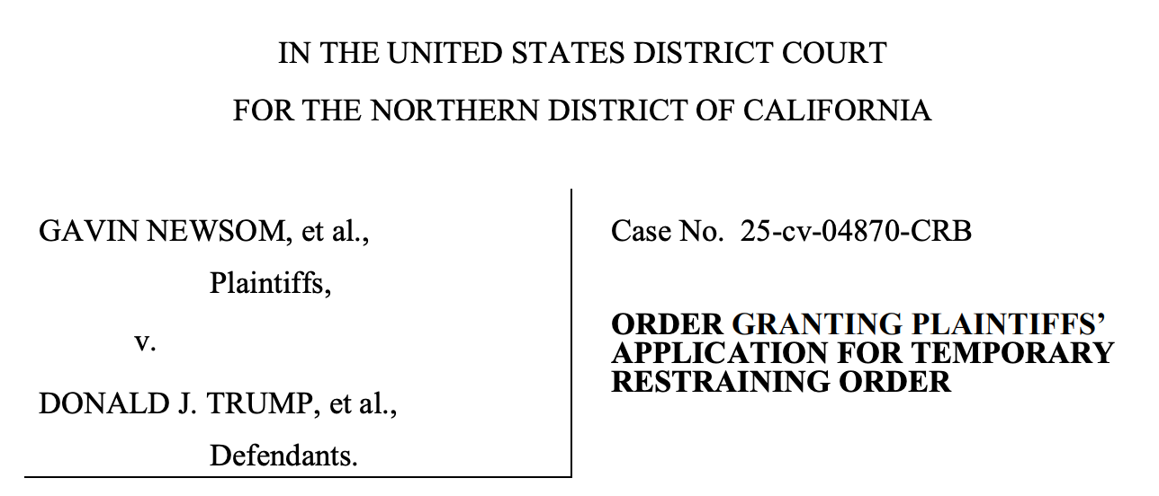 [UPDATE, 11:35 p.m. ET: By 8:30 p.m. PT, a Ninth Circuit panel had issued an "administrative stay" of Breyer's TRO through at least Tuesday — which would therefore mean Trump's activation of the California National Guard would remain in effect over the weekend absent a further court order.