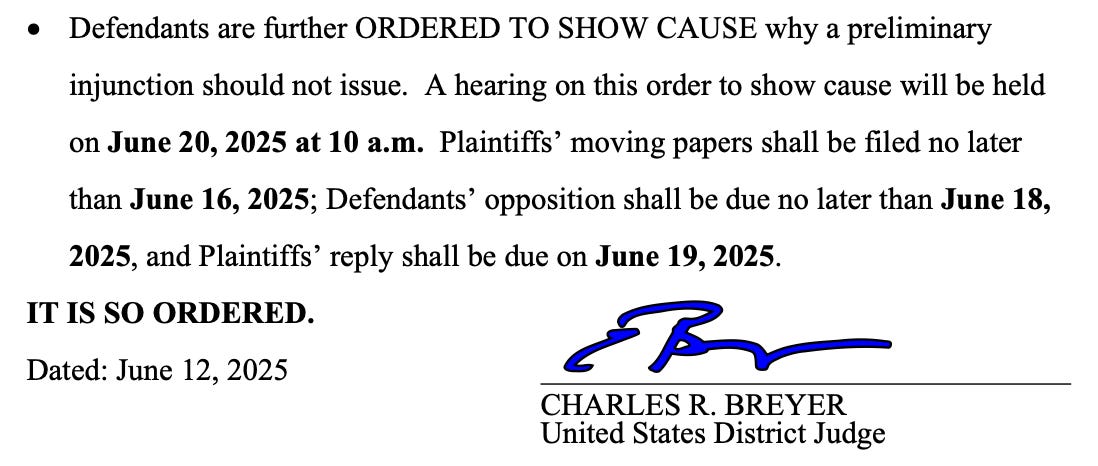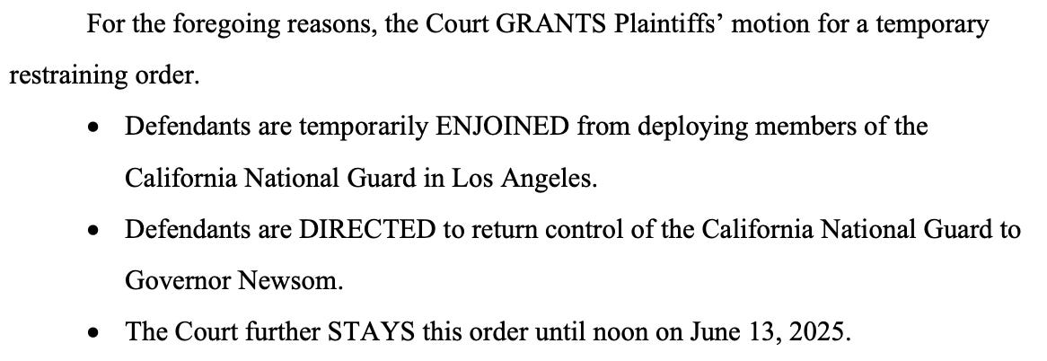 ![The Court has already concluded that Defendants exceeded their lawful authority by violating 10 U.S.C. § 12406. The Court therefore need not reach this additional basis for Plaintiffs' ultra vires claim at this early moment in the litigation. When the Court has before it Plaintiffs' motion for a preliminary injunction, the record will be more complete as to any and all military activities, and whether, as Plaintiffs contend, the presence of troops near ICE agents during raids "in dense, urban communities" indeed results in "military forces [being] drawn into a variety of law enforcement activities, such as confronting, interrogating, detaining, or searching civilians perceived as security threats." See Reply at 12. At that point— just a week from now— the parties will be free to make whatever arguments they wish in connection with the Posse Comitatus Act. The Court has already concluded that Defendants exceeded their lawful authority by violating 10 U.S.C. § 12406. The Court therefore need not reach this additional basis for Plaintiffs' ultra vires claim at this early moment in the litigation. When the Court has before it Plaintiffs' motion for a preliminary injunction, the record will be more complete as to any and all military activities, and whether, as Plaintiffs contend, the presence of troops near ICE agents during raids "in dense, urban communities" indeed results in "military forces [being] drawn into a variety of law enforcement activities, such as confronting, interrogating, detaining, or searching civilians perceived as security threats." See Reply at 12. At that point— just a week from now— the parties will be free to make whatever arguments they wish in connection with the Posse Comitatus Act.](https://substackcdn.com/image/fetch/$s_!ODVo!,w_1456,c_limit,f_auto,q_auto:good,fl_progressive:steep/https%3A%2F%2Fsubstack-post-media.s3.amazonaws.com%2Fpublic%2Fimages%2F96a6bbd2-3103-44ff-a8ff-52c821db3a4a_1160x580.png)