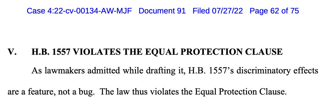 After discussing limits already placed on students, families, and teachers as a result of the law, the plaintiffs state: “As lawmakers admitted while drafting it, H.B. 1557’s discriminatory effects are a feature, not a bug.”