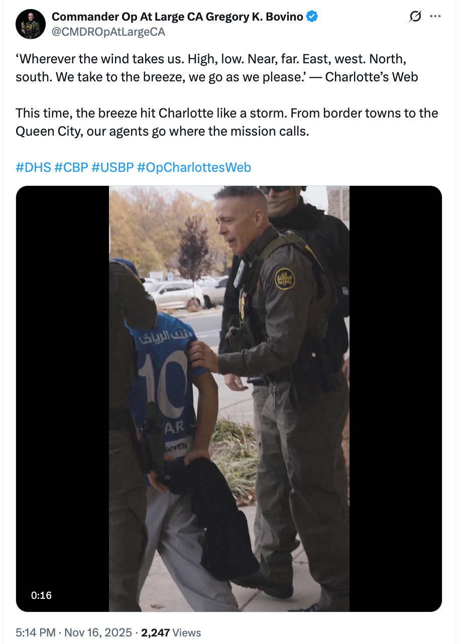 Bovino, the Border Patrol official who has appeared eager to become the face of President Donald Trump’s authoritarian anti-immigrant efforts — and whose actions in Chicago led a federal judge to get him to agree to use a body-worn camera — is unsurprisingly at the center of the Charlotte story.