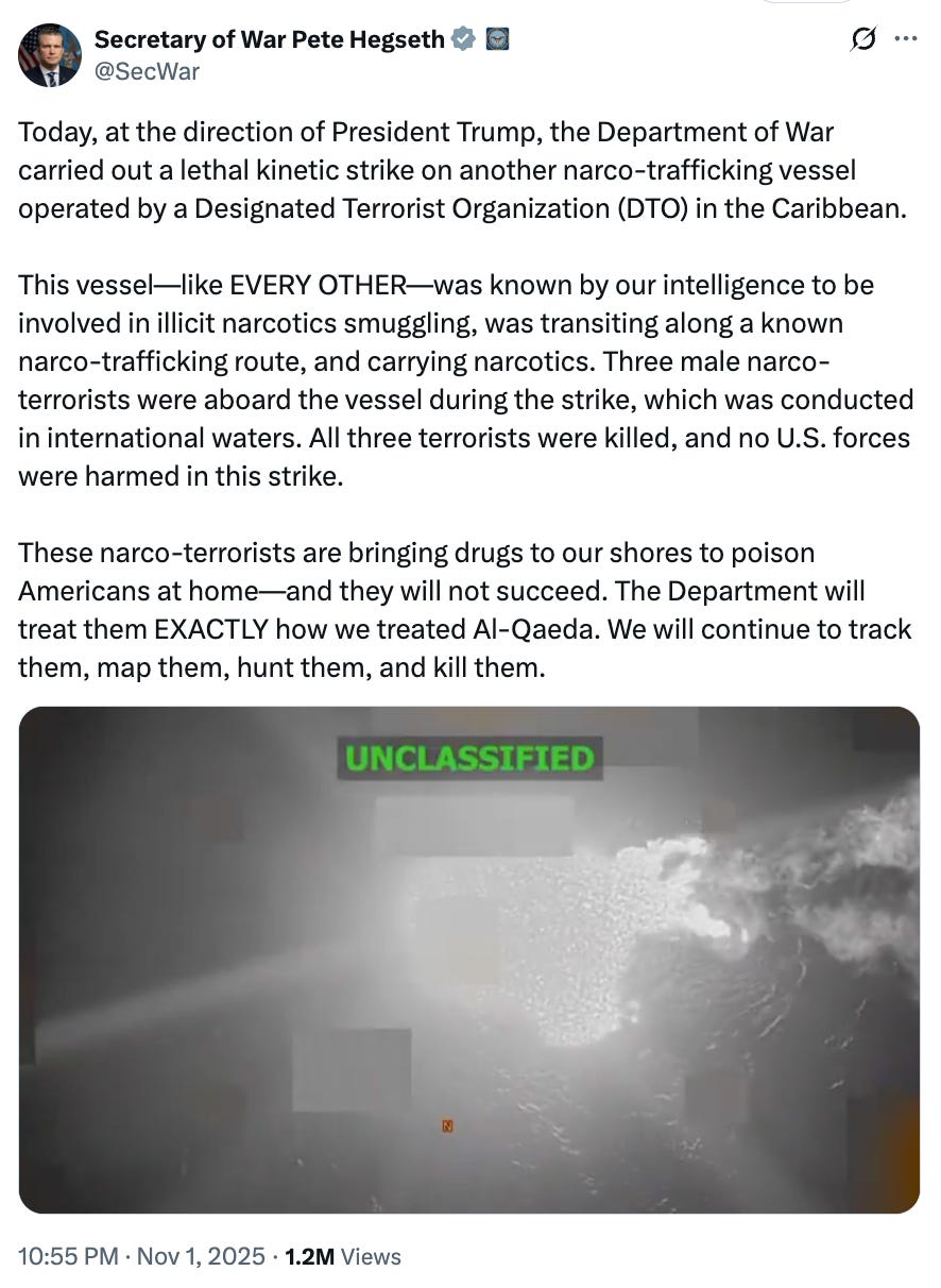 In a post on X, Defense Secretary Pete Hegseth wrote, “Today, at the direction of President Trump, the Department of War [sic] carried out a lethal kinetic strike on another narco-trafficking vessel operated by a Designated Terrorist Organization (DTO) in the Caribbean.”