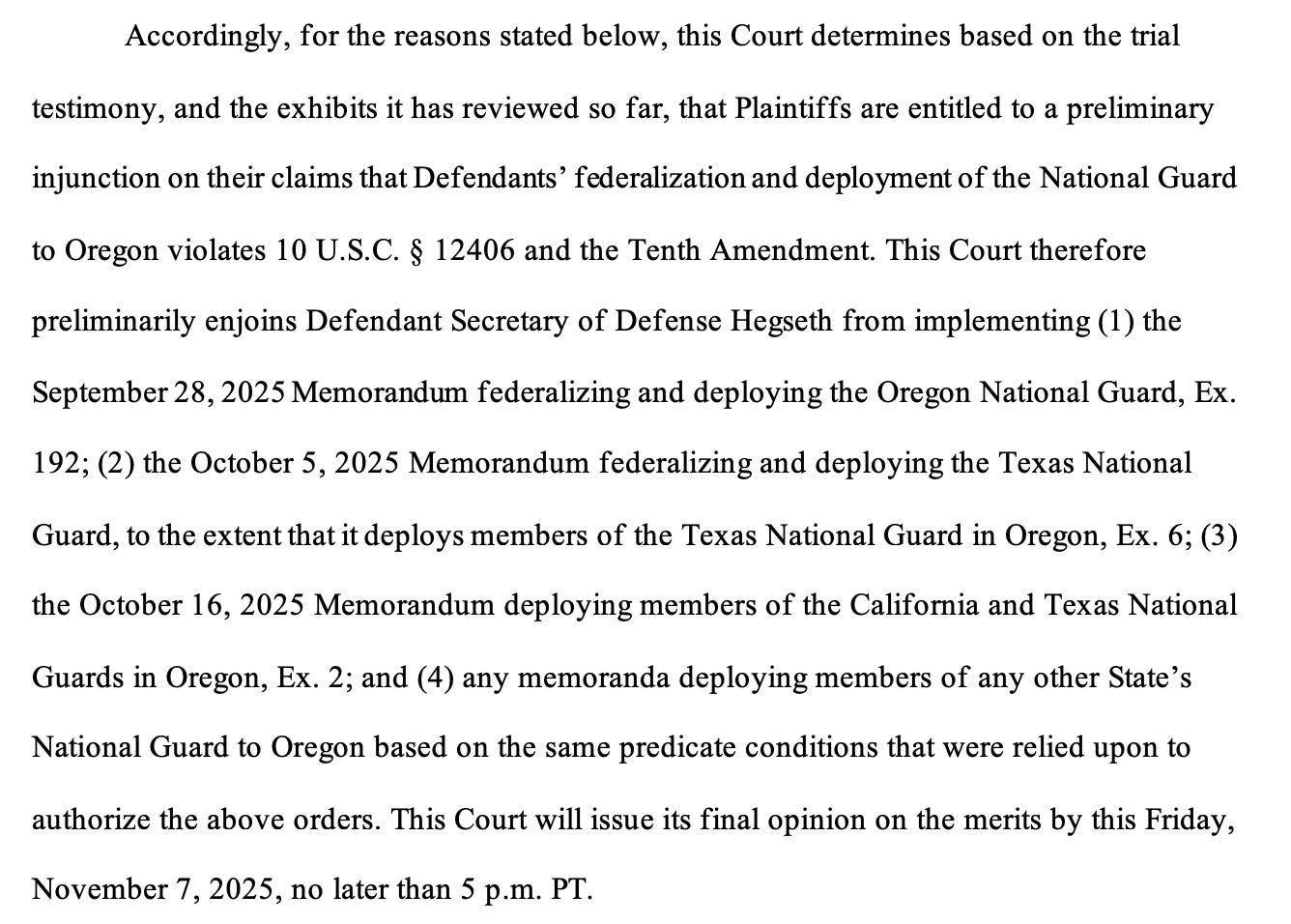 In the preliminary injunction, she blocked the federalization and deployment of National Guard in Oregon — but stayed the injunction as to the federalization “until this Court issues its final opinion on the merits,“ which she stated will come by “by this Friday, November 7, 2025, no later than 5 p.m. PT.”