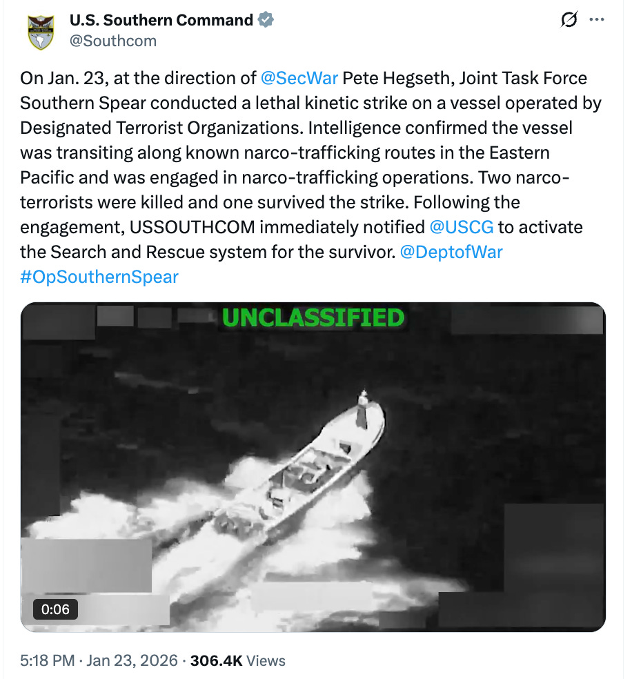 As The New York Times noted in its report, this was the “first known boat strike in the eastern Pacific since the capture of Nicolás Maduro of Venezuela“ — bringing ”the known death toll“ from the strikes “to 125 since early September.”