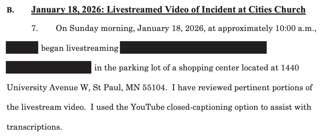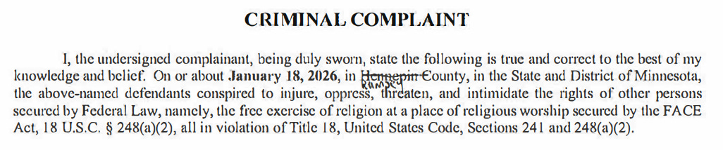 As that news spread, Attorney General Pam Bondi began live-tweeting arrests of Minnesota activists involved in a protest at a Minnesota church where one of the pastors is the acting head of the Minnesota ICE field office — and the man who submitted a declaration defending ICE’s tactics in Minnesota in litigation before U.S. District Judge Katherine Menendez alleging that the Trump administration has been violating the First and Fourth Amendment rights of protesters in the Twin Cities.