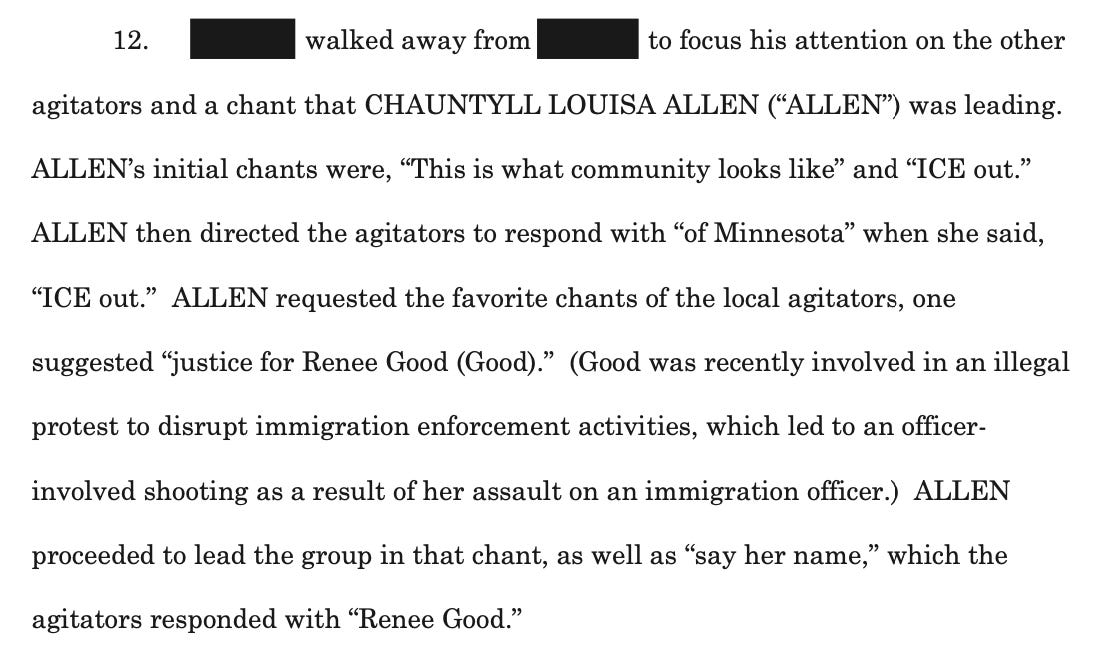 As the affidavit continues, Gerber’s claims veer further and further from constituting any sort of professional assessment. Here is how Gerber disgustingly described the killing of Renee Good by an ICE agent in a section in which Allen was discussing what chants the group preferred: