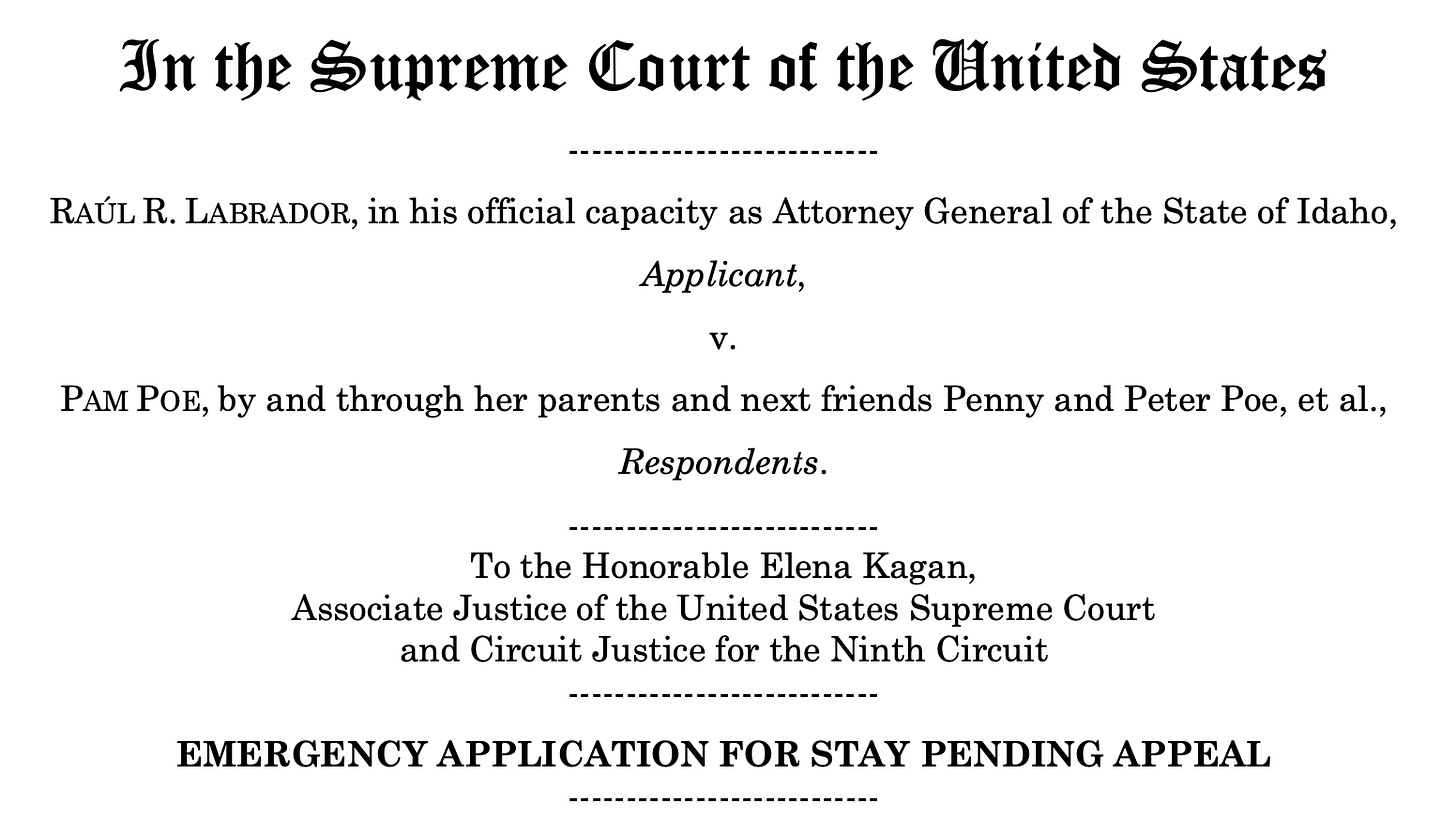 The Idaho Attorney General’s Office is asking the U.S. Supreme Court to let it enforce its 2023 ban on gender-affirming medical care for minors against anyone besides the two plaintiff minors challenging the ban while the case continues on appeal, Law Dork has learned.