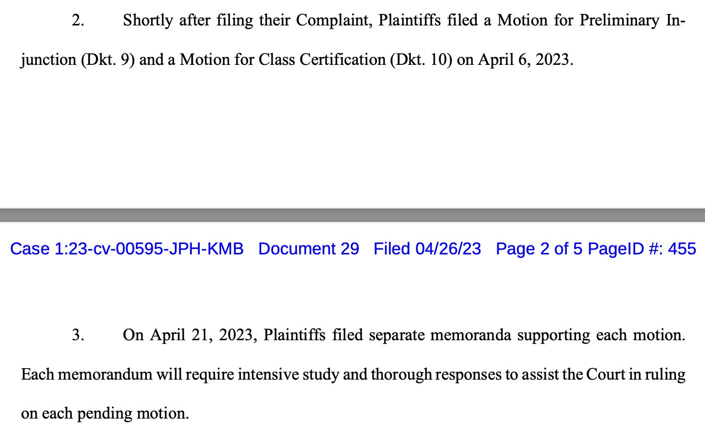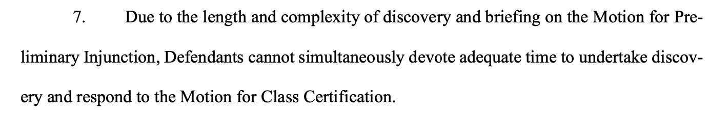 “Plaintiffs’ Memorandum in Support of Motion for Preliminary Injunction is 45 pages, briefs five distinct legal claims—each of which raises multiple sub-issues—and addresses three separate equitable factors,” they write. “Separately, Plaintiffs’ Memorandum of Law in Support of Plaintiffs’ Motion for Class Certification is 14 pages and is supported by 11 declarations totaling 38 pages.”