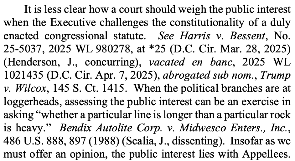 This request at the D.C. Circuit, however, was a request for a stay pending appeal and Henderson went on to discus the other factors that are included in such consideration. Among those are the public interest. Here, Henderson admitted this is a weird case: