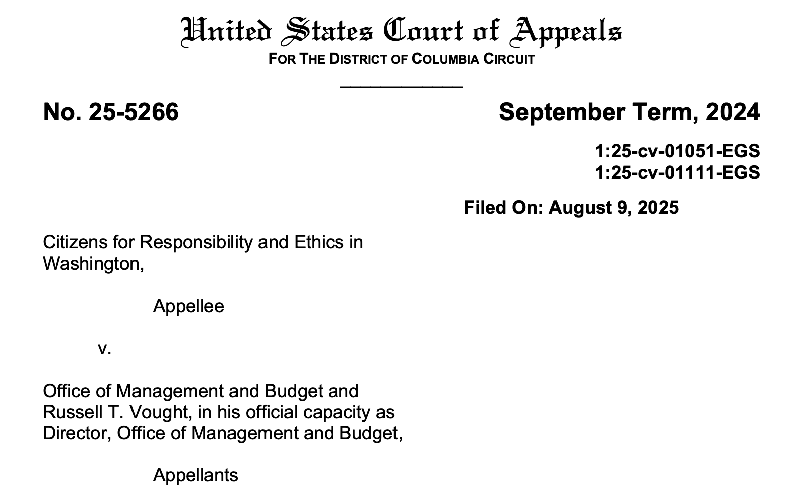 The case itself is over the Trump administration’s decision to take down a website that Congress required the Office of Management and Budget start in 2022 to track its apportionment of federal funds allocated by Congress to agencies. After working “without hiccup or objection” since 2022, Henderson explained, “the Executive—facing multiple lawsuits claiming that it was unlawfully impounding congressional funds—changed course“ in March 2025. At that point, Henderson detailed, “OMB declared ‘that the disclosure requirements made OMB’s administration of apportionments more difficult’ and so it disabled the website and declared that it would no longer operate or maintain the website.”