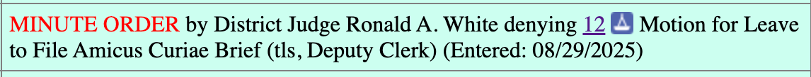 Yes, in a lawsuit where Oklahoma said DOJ and the state are “partners,” they jointly opposed the filing of a brief aimed at providing the court with information about whether the court has jurisdiction to hear the case at all.