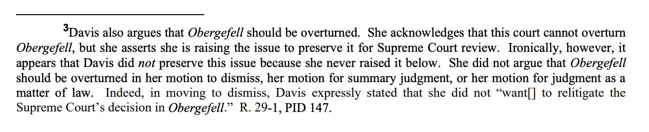 Second, and also procedurally, this was an awkward vehicle to address the issue. This was not a marriage case or even a case over a marriage license. It was, instead, a follow-up case. It was a lawsuit brought by one of the same-sex couples who alleged that Davis had violated their constitutional right to marry by refusing to issue them marriage licenses. And Davis’s primary arguments in response to the lawsuit were First Amendment-based — not about Obergefell.