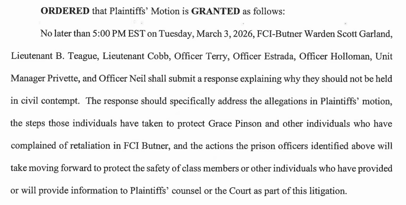 The purpose of the “show cause hearing” was to address Lamberth’s order for the BOP defendants to “show cause” why they shouldn’t face civil contempt due to allegations from Grace Pinson and her former roommate, Elmer Armando Moreno, that they have faced retaliation since Lamberth issued the February 19 protective order. DOJ filed its response on March 3, as ordered.