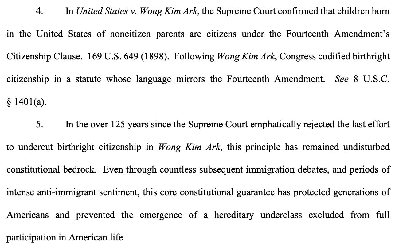Until now. Flouting the Constitution’s requirements, congressional direction, and longstanding Supreme Court precedent, Defendants attempt to upend one of the most fundamental American constitutional values by denying citizenship to babies based on their parents’ lack of permanent immigration status.