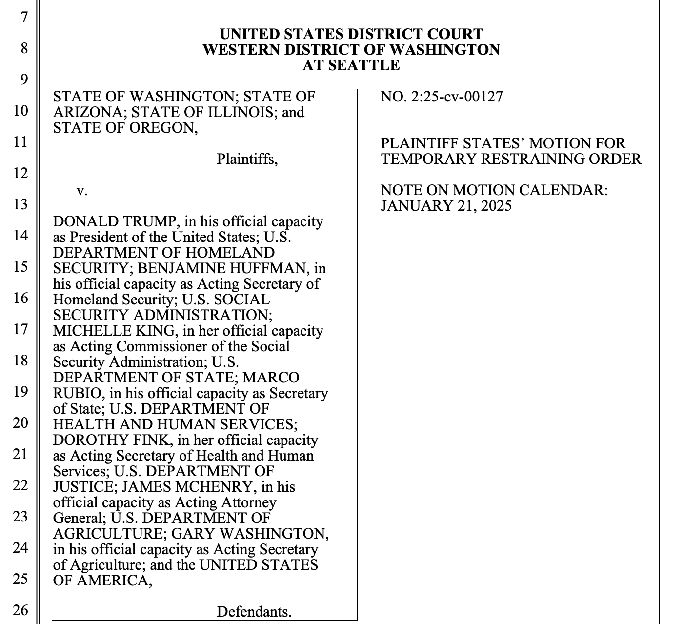 Then, there is the Seattle case. Washington’s Brown led a four-state coalition filing a similar lawsuit in the federal court for the Western District of Washington. In their case, they are looking for a quick ruling in a slightly different way, asking the court to “[t]emporarily restrain and enjoin Defendants from implementing or enforcing the Citizenship Stripping Order, pending further orders from this Court.“