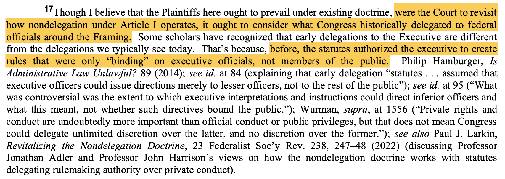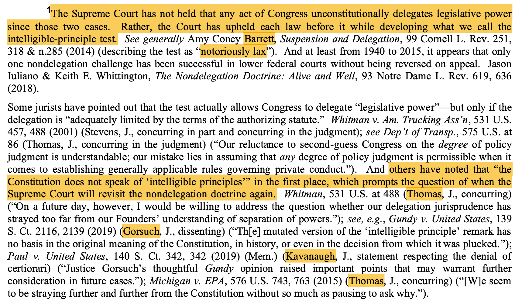 In the pages in between, the appellate judge, who has been on the court since 2018, argued that the majority, the administration, and other courts to address the issue have it wrong. He also not-so-subtly urged the Supreme Court to take up the case and, perhaps, even change the entire test for looking at nondelegation challenges.