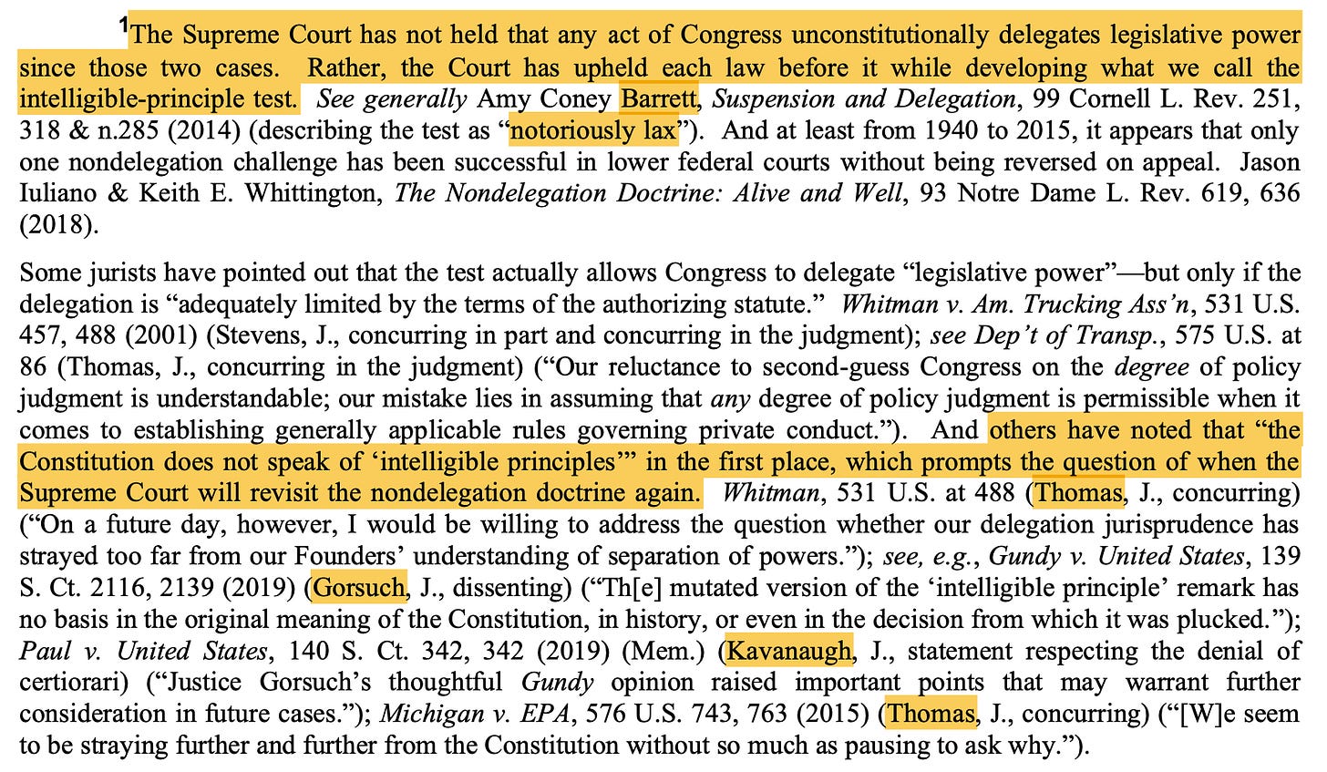 But, as noted earlier, Nalbandian doesn’t want this to be the end of this case and used footnotes to press his preferred path. In his first footnote, Nalbandian highlighted that several justices have, at least tentatively, suggested that the court could “revisit” the nondelegation doctrine.