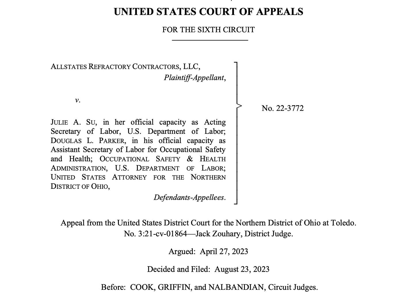 There also were significant amicus briefs arguing for Nalbandian to do exactly what he did on Wednesday. The Koch-backed Americans for Prosperity Foundation argued in an amicus brief in the Allstates case that “The Time Has Come to Enforce the Separation of Powers,“ as their brief put it in one section heading urging the appeals court to strike down OSHA’s rules. Regular Supreme Court litigator National Federation of Independent Business was on a brief lawyered by Mayer Brown, arguing that OSHA’s workplace safety rules are unconstitutional. The Pacific Legal Foundation also weighed in, perhaps most dramatically, arguing, that “if we apply OSHA’s toothless version of the intelligible principle test, we upset the social contract on which our republic stands.”