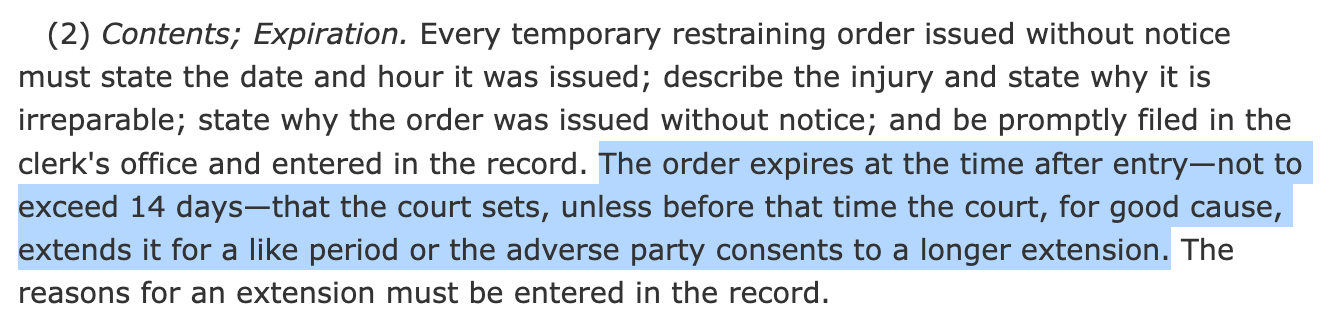 This is the relevant portion of Rule 65, which, you will see, explicitly contemplates an extension of the “14-day period” in the very same sentence where the 14-day period is described: