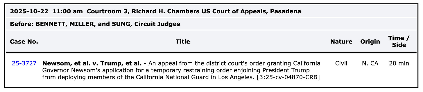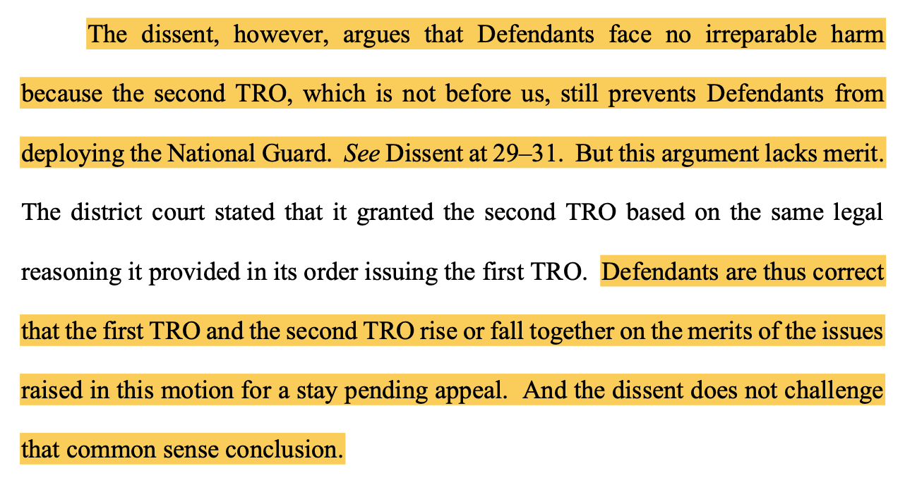 While Nelson’s concurrence should not be ignored, there is another factor to understand about what the order is not that is more central to understanding what happened on Monday. The order did not have anything to do with the second TRO issued by Judge Immergut — the order banning deployment of any National Guard in Oregon, including both the Oregon National Guard and California National Guard — which was also extended for a second 14 days on October 15.