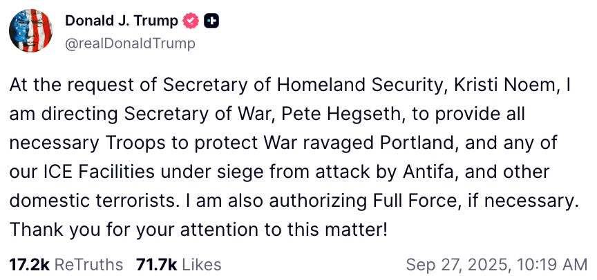The “factual background” — essentially a rundown of everything the Trump administration has claimed even concerned them anywhere in order to backfill and justify Trump’s decision to send the National Guard to Portland via Truth social post on September 27 — is embarrassingly one-sided in light of the very Ninth Circuit Newsom decision that the panel purported to be applying.